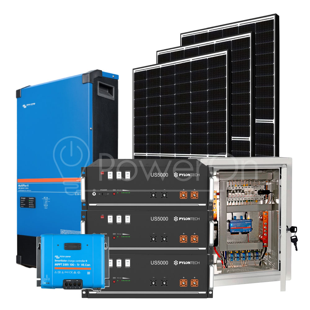 Гибридная солнечная электростанция 15 кВА с литий-железо-фосфатными (LFP) аккумуляторами на базе премиального инвертора Victron Energy MultiPlus-II 48/15000/200-100 (Нидерланды). Надежное решение, которое не только позволит обеспечить Ваш дом электроэнергией в автономном (или резервном) режиме во время перебоев с электроснабжением, а также поддерживает возможность продажи произведенной солнечной электроэнергии по Зеленому тарифу.